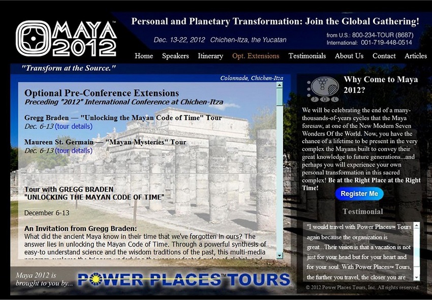 The existence of both the contradictory usage and lack of copyediting is not only shocking, but pervasive and significantly revealing of a deeper problem of ignorance and privilege. The erroneous usage in academic publications is of course the model for popular discourses of tourism and spiritualities. Figure 1 shows the promotional page for a “Maya 2012” pilgrimage tour from the website Power Place Tours. The screenshot highlights two talks, both incorrectly using Mayan in the titles, “Mayan Mysteries” and “Unlocking the Mayan Code of Time.” The text asks: “What did the Maya [correct use] know in their time that was forgotten in ours?” In the right hand, column of the ad, the promotional text asks, “Why come to Maya 2012” [correct use] and answers in confusion: