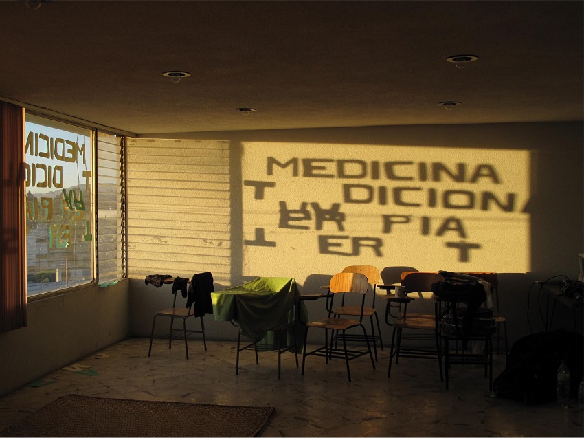 It has started raining, and once we arrive at the Universidad Indígena, the only distraction left is to wander from room to room chatting.