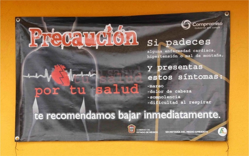 The next morning, after about an hour’s wait, the journey begins in the minibus. We travel for more than an hour, leave Toluca and climb up the side of a mountain. The weather changes and the sunny sky gives way to threatening grey clouds. The minibus stops in front of a sign indicating the destination El Parque del Nevado de Toluca. We walk on, the rain soon turns to snow. The shaman walks at a fast pace at the head of the group. The women follow him with difficulty. After a few kilometres of walking, we arrive at the entrance of the park, where there is a hut with some guards and drinks for sale. The shaman, excited, describes the day’s programme, which consists of walking to the top of the Nevado, where there is the crater of an extinct volcano which, over the millennia, has given way to two lagoons, El Sol and La Luna. As the man enthusiastically encourages us to admire the arid, mountainous landscape, we notice that one of the women, Claude, is missing. She limps in, staggering. She eventually joins the group, but she is clearly in trouble. Her face is pale and she is breathing heavily. Her chest hurts and she finds it difficult to speak. The shaman continues the walk. Jeanne and I decide to stop at the hut with Claude, who obviously can’t go any further. We are at 3,600 meters of altitude and an eloquent sign from the Mexican government warns against the dangers of the high mountains, advising us to come down at the slightest symptom of altitude sickness: mareo, dolor de cabeza, somnolencia, dificultad al respirar... (Figure 5) Claude wants to go home, and asks the shaman’s father-in-law if she can’t be taken home. The driver, embarrassed, replies that it would be better to wait for the shaman with the other members of the group, and then leave together. Claude, resigned, says that this is certainly an important test for her and that she must find the strength to overcome it. She tries to concentrate on her breathing, to stay focused on herself. She says that there are Indian yogi masters who succeed through their discipline in slowing down the heartbeat until it stops, by sheer force of will. She sits and breathes, trying to find a more appropriate rhythm. An hour passes and the man comes down with the other four women. Aurélie is excited; she talks about the beauty of the lagoons, the masculine and feminine energy she felt in the depths of her being, the vibrations of the drum that beat in unison with her heart.