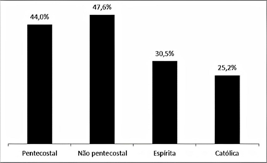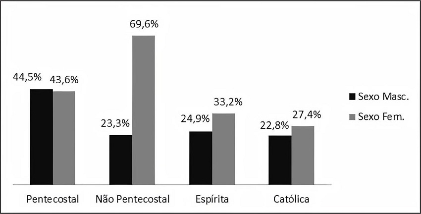 Também observamos que, em quase todos os segmentos, a religião é um compromisso mais frequente entre as mulheres do que entre os homens, sobretudo nas igrejas não-pentecostais, ou seja, tradicionais (gráfico 2). O destacado compromisso feminino com a religião observado neste estudo vai ao encontro do entendimento de que a figura feminina esteve sempre presente na difusão da religiosidade, no aperfeiçoamento e continuidade das tradições religiosas, empenhando-se na busca pela preservação do sagrado. Entretanto, segundo Roscoche (2016), as mulheres têm reivindicado maior inserção no âmbito das religiões e suas esferas de poder.