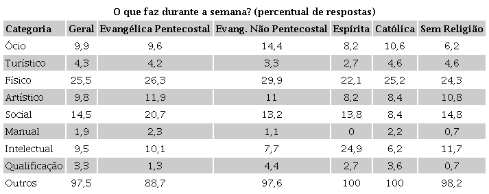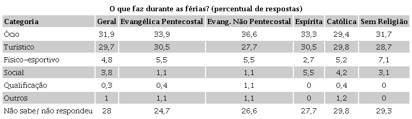 A respeito das vivências durante as férias, as respostas apresentam uma pequena variação. Independente do segmento religioso ou nãoreligioso, parte das pessoas (28%) não sabem ou não quiseram responder o que fazem durante as férias. As pessoas que responderam indicam que o ócio, para 31,9%, e as atividades turísticas, para 29,7%, são as atividades mais comuns no período (quadro 3). Esses dados levam ao entendimento de que o período das férias não é o tempo da socialização, nem mesmo a promovida pela igreja, nem das práticas esportivas, mas é o tempo em que o ócio pode ser vivenciado, assim como os passeios.