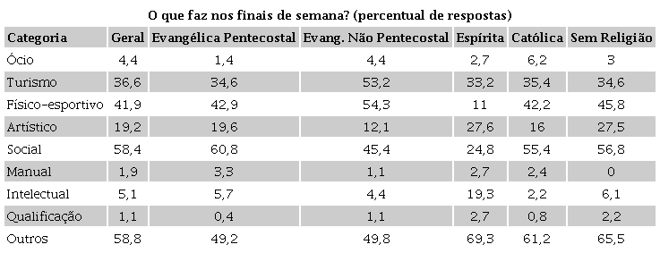 Além do turismo, a categoria “Outros” se destaca entre as opções de atividades de finais de semana. A maioria dos/as espíritas (69,3%), das pessoas que declaram não ter nenhuma religião (65,5%) e dos/as católicos/as (61,2%) alegam que fazem no final de semana atividades diferentes das categorias: ócio, turismo, físico-esportivo, artístico, social, manual, intelectual e qualificação/estudos. Também se encaixam nessa categoria, as respostas de grande parte dos/as evangélicos/as pentecostais (49,2%) e dos não-pentecostais (49,8%). A categoria “Outros” agrupa atividades distintas como as tarefas domésticas, os compromissos religiosos, o trabalho formal e informal, redes sociais e internet, tomar cerveja e assistir televisão.