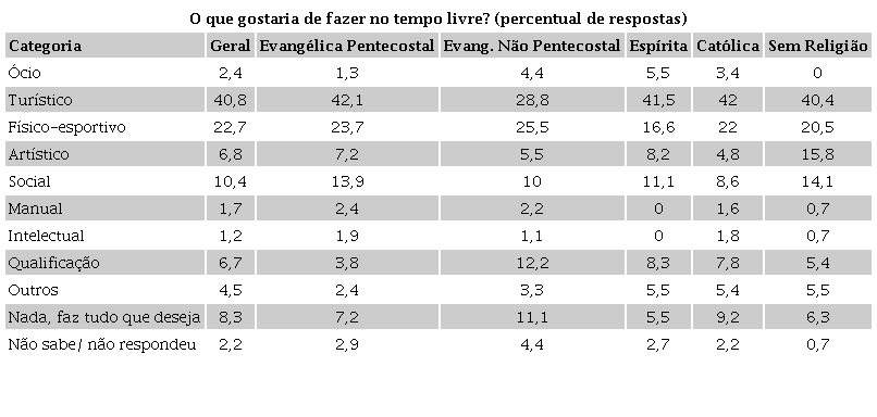 Sendo o lazer uma dimensão da cultura, e esta uma prática de significação em que diferentes grupos produzem e são produzidos, é no âmbito da cultura e seus atravessamentos econômicos, políticos e sociais que as vivências e os desejos relacionados ao tempo livre são constituídos e ganham significados (Paraíso, 2010). Nesse sentido, quando as pessoas foram perguntadas sobre o que gostariam de fazer em seu tempo livre, todos os segmentos responderam majoritariamente pela categoria “turismo”, seguido de “físico-esportivo” e “sociais”. Em termos gerais, 40,8% das pessoas gostariam de fazer alguma atividade relacionada à categoria “Turística”, 22,7% atividades físico-esportivas e 10,4% atividades sociais. Os segmentos religiosos e o não-religioso apresentam percentuais próximos aos dados gerais, com exceção dos/ as evangélicos/as não-pentecostais em que 28,8% gostariam de fazer atividades turísticas (quadro 4).
