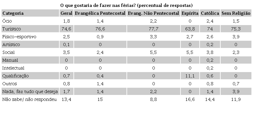 Com relação às férias, as respostas confirmam que quando se trata de aspirações sobre o lazer, a religião não é fator determinante. 74,6% da amostra no Sudeste deseja usufruir de atividades relacionadas ao turismo nas férias, com pequenas variações entre as religiões. O turismo seria uma opção de 76,6% dos/as evangélicos/as pentecostais, 77,7% dos/as evangélicos não-pentecostais, 63,8% dos/as espíritas, 74% dos/ as católicos/as e 75,3% das pessoas que não têm religião (quadro 5). Esses percentuais representam mais do que o dobro de pessoas que responderam que praticam alguma atividade turística durante as férias, que no geral foi de 29,7%.