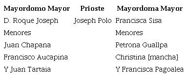 […] En el Pueblo de S. Juan de Talina en dos días del mes de febrero de mil setecientos i veintiocho años hize llamar a toque de Campana a toda la feligresía de este Pueblo y a los Prinzipales del y Juntos y congregados reofrezieron de su voluntad a ser Priostes y Mayordomos para el año venidero los siguientes.