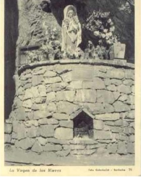La “Virgen de las Nieves” no sólo es la Patrona de la diócesis de Bariloche, sino también de dos sectores relevantes en la sociedad barilochense: los montañeses y el Ejército de Montaña. La primera imagen que trajo Irusta se apoyó directamente en una roca donde caía una vertiente natural en tierras del Ejército de Montaña4 (imagen 1). Por el deterioro del clima, esta imagen se reemplazó por la actual en 1957 y se la colocó en la misma Gruta detrás de un vidrio5 (imagen 2). Según la narración recogida por el Obispado, los 5 de agosto, día de la “Virgen de las Nieves”, se celebraba en la Gruta el Día del Montañés y los fieles iban en procesión organizados por un sacerdote6.