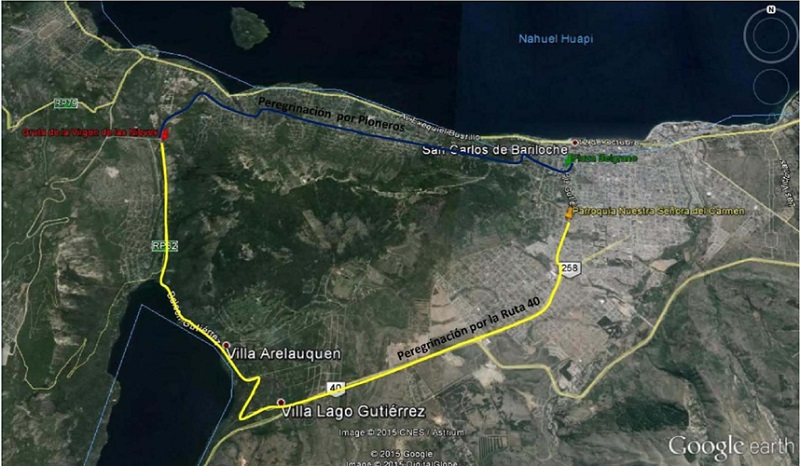 El Obispo R. Frassia (1993-2001) participó en las reuniones de preparación y puso en marcha una comisión organizadora que continuó trabajando de forma más sistemática afianzando la modalidad inter parroquial. En estas reuniones se incorporaron algunas actividades devocionales como: la Misa de los abuelos, el sábado anterior a la peregrinación general; la vigilia de las parroquias la noche anterior con rezos e intenciones y la participación organizada de las parroquias con pancartas y banderas. En la actualidad, todas las parroquias de Bariloche peregrinan de forma conjunta y acuerdan un horario de salida para converger en la Gruta y celebrar la misa. Las vías de peregrinación son la Avenida Bustillo paralela al lago Nahuel Huapi, la Avenida Pioneros (paralela a la Avenida Bustillo hasta el kilómetro 8) y la Ruta 258, que atraviesa la zona alta de la ciudad. Con la participación de los peregrinos de la Línea Sur10, la peregrinación traspasó el espacio local y se transformó en “un acto diocesano”. El Bolsón, Ing. Jacobacci y Pilcaniyeu. Con ello no sólo se logró ampliar la convocatoria y empezar a darle un perfil multitudinario sino que se reforzó la línea pastoral de la “opción por los pobres”, convocando a la población de la diócesis mas carenciada y castigada11 y como signo el Obispo Maletti (2001-2013), sucesor del Obispo Frassia, encabezó esa columna en la Peregrinación del 200412.