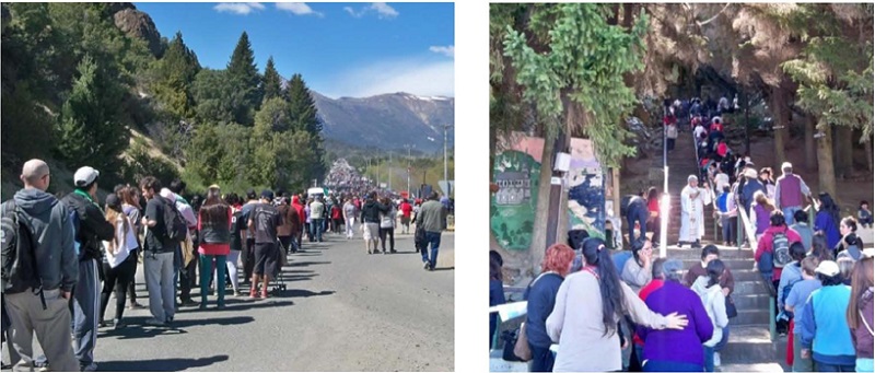 En estos escenarios a los que van arribando los peregrinos y otros actores sociales, se pueden distinguir cuatro lugares por donde los devotos circulan: la Gruta con la imagen, la palestra “de la Virgen”, donde el Ejército realiza sus prácticas de montañismo; el predio adyacente a la Gruta, lugar donde se concentra la feligresía católica inter parroquial con sus pancartas y se lleva a cabo la misa comunitaria; y los puestos de venta de comida y objetos vinculados o no a la devoción mariana.