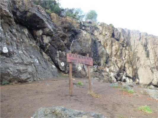 En las cercanías del espacio sagrado de la Gruta y en dirección al predio en donde se realiza la misa comunitaria, se visualiza el segundo lugar: la palestra del Ejército denominada “Palestra Virgen de las Nieves” (imagen 5). Este lugar si bien es poco recorrido por los devotos, únicamente como “paso” hacia el predio, forma parte del “circuito religioso” que se construye en torno a la devoción recordando su fuerte vinculación con uno de sus patronazgos y sus orígenes.