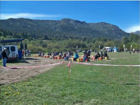 La “Palestra de la Virgen” es un espacio de transición entre la Gruta y el predio de la Misa. Tanto su localización física como su denominación remiten a una transición simbólica y material. Es un espacio que alude a un patronazgo que perdura y que lleva la huella histórica del inicio del culto a la Virgen de las Nieves en Bariloche: Patrona de la Escuela Militar de Montaña. Ese espacio intermedio es también una cuña en las relaciones interinstitucionales entre la Iglesia diocesana y el Ejército de Montaña, que se alternan con su presencia: la Iglesia con sacerdotes confesando y los militares ejercitándose en la palestra. Este espacio constituye también un campo de negociaciones políticas por la pertenencia de esas tierras que el Ejército no cede ni vende15 y que mantienen a través de su presencia material con las prácticas de palestra que se realizan incluso durante la peregrinación y procesión. La Iglesia diocesana señala que “la ubicación de la Gruta y su inicial presentación en el terreno donde se encuentra, ha sido preservado, fundamentalmente por la acción del Ejército, sus Directores y el personal de Oficiales, Suboficiales y Soldados y luego también por la perseverante y creciente devoción entre la gente del lugar”16. Este objetivo común que une a los devotos y los militares es el argumento del Obispo para solicitar esas tierras en comodato y construir allí un Santuario17.