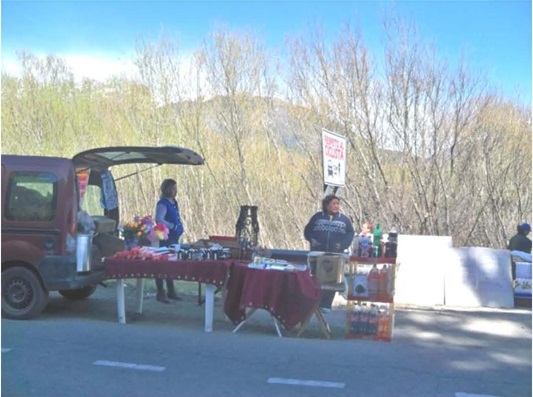 El último lugar en el que se desarrollan los festejos devocionales son los puestos de ventas de objetos religiosos y de comida (imagen 7). Estos puestos con el correr de los años son cada vez más numerosos y se ubican al otro lado de la ruta, enfrente de la Gruta.