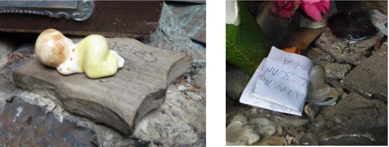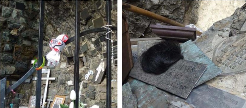 En relación a los objetos materiales se pueden mencionar: mechones de pelo, pañuelos, pulseras, chupetes, fotos, prendas de vestir, cintas, banderas, etc. Los mechones de pelo resultan una ofrenda muy tradicional en el culto mariano, un valor simbólico que alude a “la belleza de la mujer presente en el largo del cabello”23 (imagen 9). Los muñecos, como bebes de porcelana, también forman parte de los agradecimientos y se vinculan directamente con la acción de encomendar al recién nacido a la devoción (imagen 10). Sin embargo, el resto de los objetos están más relacionados con pedidos específicos por familiares enfermos, a través de las fotos, chupetes, pañuelos, prendas de vestir; por equipos de futbol, con camisetas, cintas y banderas y; por familiares fallecidos, a través de fotos y cartas (imágenes 11 y 12).