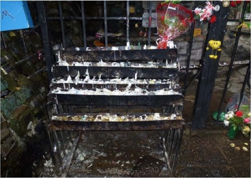 En la segunda tipología hemos agrupado a dos objetos muy característicos del culto mariano como son las flores y las velas. Ambas forman parte del ritual tradicional de la visita del devoto a la gruta. Las flores, en la mayoría de los casos constituyen el medio que más utilizan los fieles para agradecer y embellecer a la imagen de devoción. Se llevan tanto flores naturales como artificiales que se colocan en botellas y en la reja que protege a la ermita. Las velas, por su parte, están relacionadas con los pedidos y las promesas de los fieles luego de la peregrinación anual. Estos pedidos se activan a partir del encendido de la vela, ritual fundamental para los pedidos, promesas y ofrendas que realiza el devoto. Las velas, para evitar cualquier tipo de peligro de incendio forestal, se colocan en un candelero especial que se ubica por delante la reja y sobre el costado izquierdo de la Gruta. Respecto a esto último en una peregrinación del 2001 el Padre Juvenal Currulef consultó con un ingeniero para tomar medidas y encargó el trabajo de las bandejas con porta velas a un artesano (imagen 13). En la peregrinación del año 2009, en relación con el peligro que conlleva el encendido de velas, se “invita a los peregrinos cambiar su ofrenda de velas por un alimento no perecedero”24.