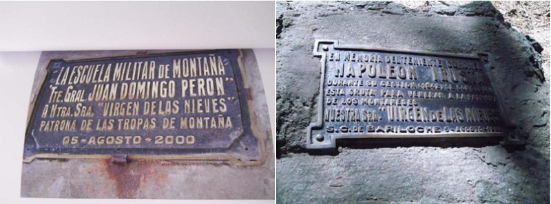 Entre los exvotos se encuentran el recordatorio del que simbólicamente fundó esta devoción en la Gruta: la placa de Napoleón Irusta y la del patronazgo del ejército de montaña (imágenes 19 y 20). Estas placas y patronazgos sirvieron como fundamentación para el pedido al ejército de las tierras para el Santuario. “Allí fueron grabados entre sus piedras y el tronco de sus pinos, diferentes agradecimientos y dedicatorias, ruegos y entregas espirituales. Es de notar justamente, entre los cuerpos de sus pinos donde se observan claramente importantes placas de Coroneles, Capitanes y Oficiales pertenecientes a la fuerza, quienes murieron con la esperanza y fe en nuestra amada Virgen de las Nieves”25.