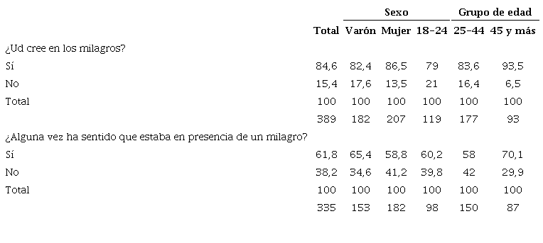 Estos datos se complementan con la fuerte creencia en los milagros. El 84% de la población del universo de estudio manifestó creer en los milagros, con independencia de su afiliación religiosa; dos tercios de los cuales afirma haber estado en presencia de un milagro alguna vez (Cuadro 2), y lo reportan con pequeños relatos. La mayoría se concentran en motivos de salud y sanación. La magnitud del dato es relevante.14 Remiten a la relevancia que en la matriz cultural tiene la otra lógica, a la que hicimos alusión, en la que se destacan los aspectos cosmológicos y holísticos.