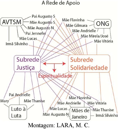 A figura busca evidenciar a rede de apoio, mostrando os diferentes grupos de familiares, informantes da pesquisa, que interagem visando, em um primeiro critério de delimitação, à justiça; ou seja, trabalham coletivamente organizando atos públicos para pressionar as instituições no andamento do processo judicial, da mesma forma que almejam estabelecer empatia com a população. O segundo critério de delimitação foi a motivação por ações de solidariedade, apoio social a pessoas carentes da cidade, campanhas de arrecadação de alimentos, roupas e material de higiene pessoal que são doados aos familiares das vítimas e sobreviventes que vivem em situação de vulnerabilidade social e para instituições de apoio a crianças e idosos. Com isso, estabeleceu-se uma subrede de solidariedade que reúne também familiares dos diferentes movimentos, porém alguns não participam das ações na busca por Justiça. O fator de aproximação das duas subredes e da dinâmica da rede de apoio é a espiritualidade.
