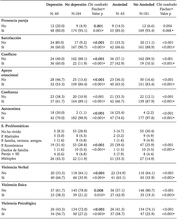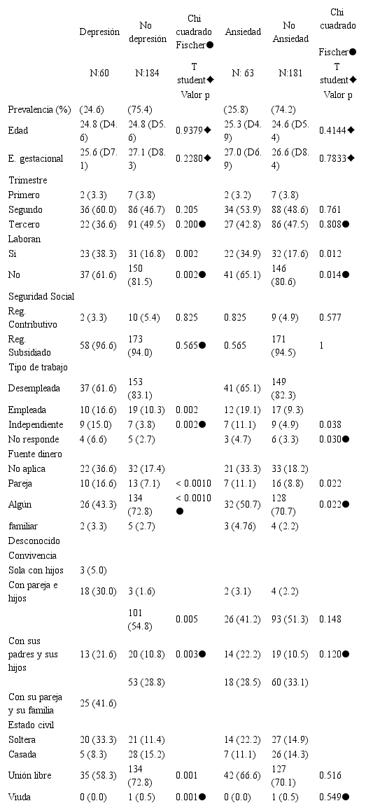 Resultados. En 244 gestantes con edad promedio de 24.8 años la prevalencia de depresión fue del 24.6 %, y de ansiedad del 25.8 %. La depresión está asociada con antecedentes familiares de depresión a razón de prevalencia (RP) de 2.0; presencia de ansiedad a RP de 22.5, y consumo de alcohol a RP de 2.9. Como factor protector se encontró que la paciente tenía dos fuentes de ingresos (pareja y familia), a RP de 0.6. La ansiedad se asoció a presencia de depresión a RP de 13.3; la presencia de violencia psicológica a RP de 2.3, y no tener confianza en la pareja, a RP de 3.4.