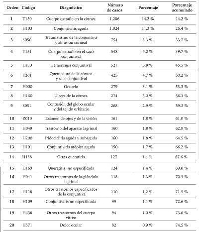 urgencias en la institución seleccionada durante los años 2014 y 2015. Las patologías se identificaron con base en los códigos de la Clasificación Internacional de Enfermedades, CIE-10. Para ello, se revisó el sistema de historia clínica electrónica y se exportaron los datos a una hoja de cálculo en un software informático (Excel® de Microsoft Corporation, Redmond, Washington, EEUU). Se consideró, como criterio de inclusión, haber consultado al servicio de urgencias oftalmológicas luego de una evaluación adecuada por el servicio de triaje. No se consideraron criterios de exclusión. Se tomaron los datos de los 20 primeros diagnósticos registrados.