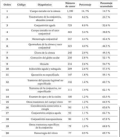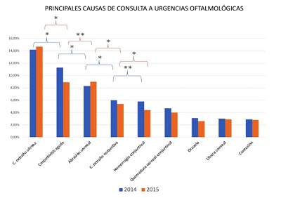 Las primeras veinte causas encontradas en 2014 y 2015 representaron el 70% de las consultas oftalmológicas al servicio de urgencias.