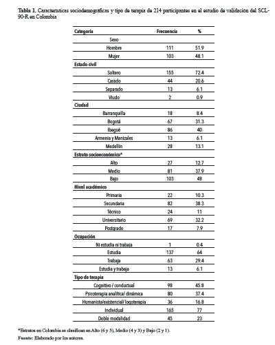Tabla 1.Características sociodemográficas y tipo de terapia de 214 participantes en el estudio de validación del SCL- 90-R en Colombia