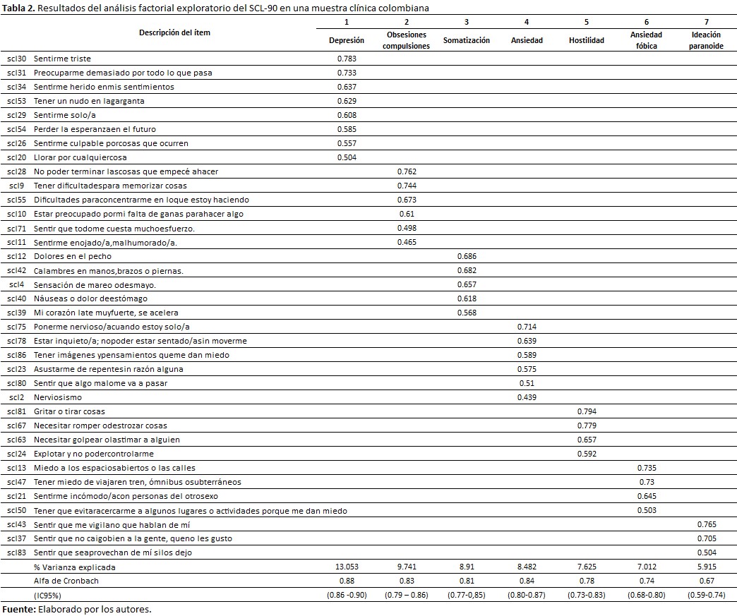 Tabla 2. Resultados del análisis factorial exploratorio del SCL-90 en una muestra clínica colombiana.