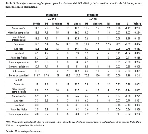 Tabla 3.Puntajes directos según género para los factores del SCL-90-R y de la versión reducida de 36 ítems, en una muestra clínica colombiana.