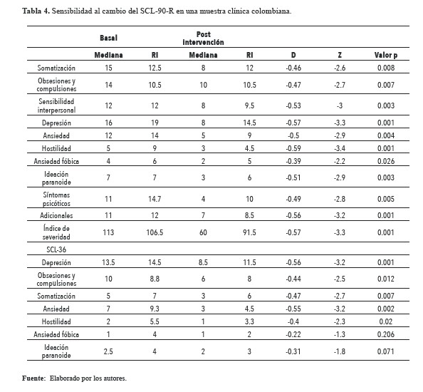 Tabla 4. Sensibilidad al cambio del SCL-90-R en una muestra clínica colombiana.