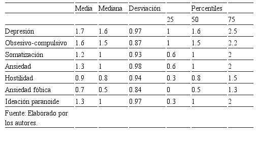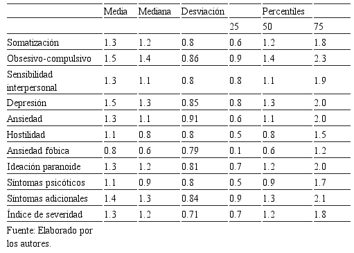 El instrumento utilizado fue el SCL-90-R (2), un cuestionario de detección rápida auto administrado que se compone de 90 ítems tipo likert de 0 a 4 (0 = nada en absoluto; 1 = un poco; 2 = moderadamente; 3 = bastante; 4 = extremadamente). El paciente responde a cada ítem en función del malestar que le haya causado durante la semana anterior, incluyendo el día en que completa el cuestionario. Se obtienen puntuaciones para nueve factores: somatización, síntomas obsesivos y compulsivos, sensibilidad interpersonal, depresión, ansiedad, hostilidad, ansiedad fóbica, ideación paranoide y síntomas psicóticos. Además, pueden obtenerse tres índices globales: Severidad Global (Global Severity Index)(media de todos los ítems), el total de Síntomas Positivos (Positive Symptom Total) (basado en los síntomas que se puntuaron con 0 o nada en absoluto) y el índice de malestar por Síntomas Positivos (Positive Symptom Distress Index) (basado en los ítems que se puntuaron con 0 o nada en absoluto). La duración del cuestionario es de 12 a 20 minutos. Los puntajes para cada factor se obtienen buscando el promedio de las puntuaciones (sumatoria de ítems dividido por el número de ítems) (4). Los factores evaluados son las siguientes: