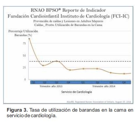 Para la evaluación de la guía de prevención de caídas y lesiones por caídas en adultos mayores se incluyeron 2,208 pacientes reclutados en3 servicios de cardiología y cirugía cardiaca, y 4,154 pacientes en 3 servicios de medicina interna-cirugía. Entre los resultados más destacados de la implementación de esta guía está la adherencia del personal de enfermería representada en el uso de la escala de riesgo Stratify en el 100% de los pacientes nuevos admitidos; y en la evaluación del riesgo del 100% de pacientes posterior a una caída. La tasa de caídas se redujo de 15.0 a 12.0 por 1,000 días/paciente admitidos. Se observó además una reducción en el uso de las barandas alrededor del 80% en pacientes a riesgo por el personal de enfermería (Figura 2 y Figura 3).