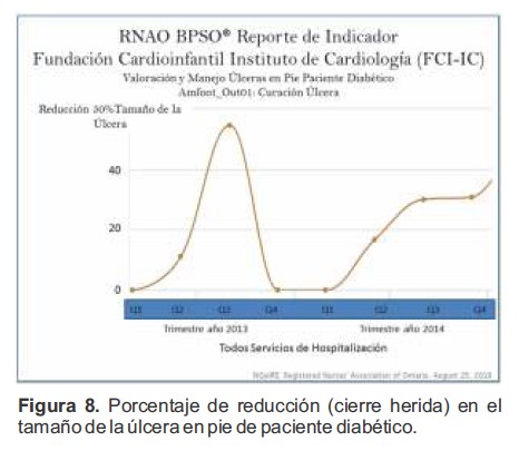 Finalmente, la guía de valoración y manejo de úlceras en pie diabético, aunque incluyó el reclutamiento de pacientes en todos los servicios de adultos (8 en total), contó para esta evaluación (denominador) con 87 pacientes con diagnóstico de diabetes y úlcera en uno o en ambos pies. Los resultados evidenciaron un incremento del 100% en actividades de cuidado a pacientes diabéticos como las valoraciones en miembros inferiores (Figura 5), valoración de pies y úlceras (Escala de Texas) (Figura 6) y aumento en la educación impartida al paciente y su familia con reporte en historia clínica completa (Figura 7). La evaluación de la reducción del tamaño en la úlcera en pie fue del 30% (Figura 8).