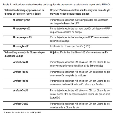 Tabla 1. Indicadores seleccionados de las guías de prevención y cuidado de la piel de la RNAO