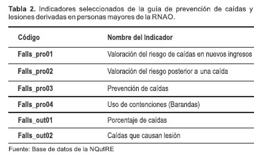 Tabla 2. Indicadores seleccionados de la guía de prevención de caídas y lesiones derivadas en personas mayores de la RNAO