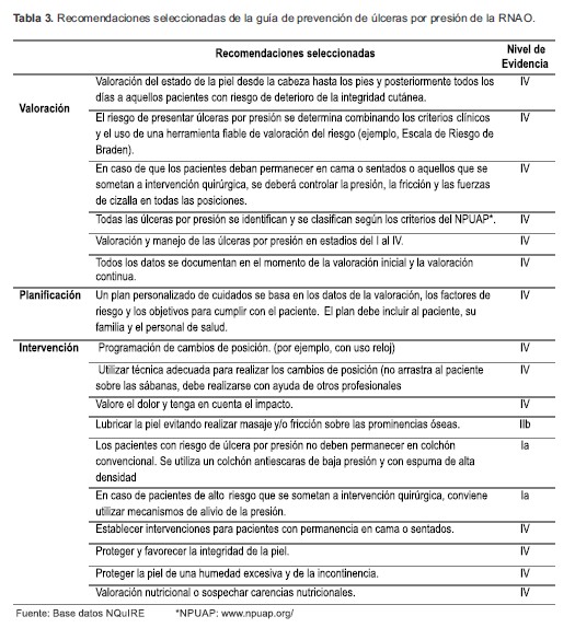 Tabla 3. Recomendaciones seleccionadas de la guía de prevención de úlceras por presión de la RNAO.