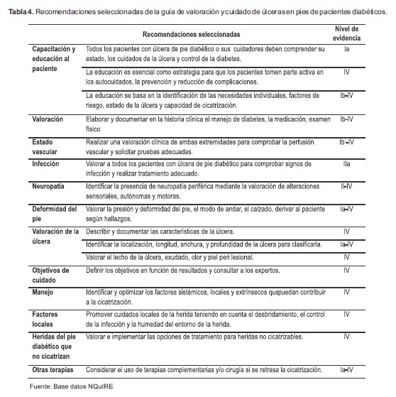 Tabla 4. Recomendaciones seleccionadas de la guía de valoración y cuidado de úlceras en pies de pacientes diabéticos.