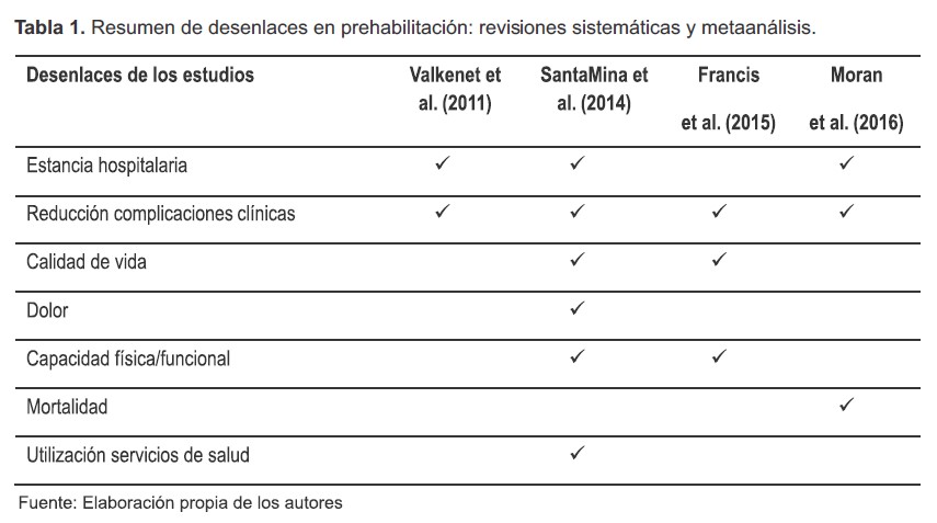 Tabla 1. Resumen de desenlaces en prehabilitación: revisiones sistemáticas y metaanálisis.