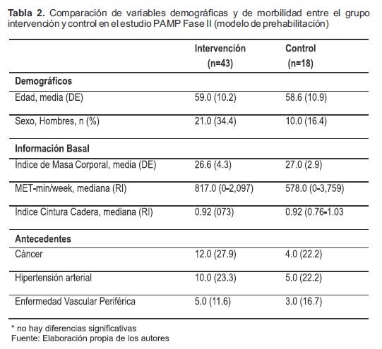 Tabla 2. Comparación de variables demográficas y de morbilidad entre el grupo intervención y control en el estudio PAMP Fase II (modelo de prehabilitación)