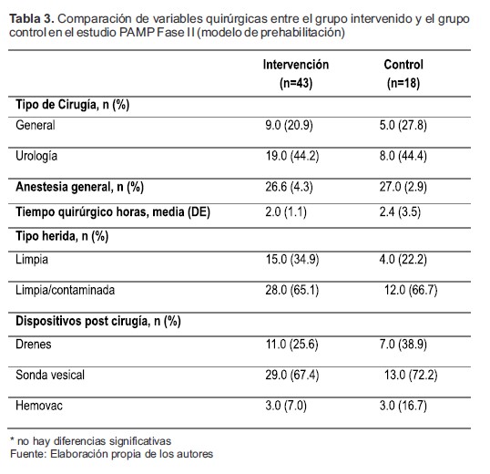 Tabla 3. Comparación de variables quirúrgicas entre el grupo intervenido y el grupo control en el estudio PAMP Fase II (modelo de prehabilitación)