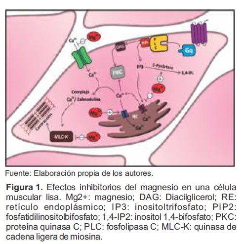 El magnesio actúa como antagonista natural del calcio (Ca2+), elemento clave en la contracción del músculo liso. Su antagonismo se da de diferentes formas: la primera comienza extracelularmente por modificación de la polaridad en la membrana celular, aumentando el umbral de activación de los canales de calcio dependientes de voltaje. La segunda, por bloqueo mecánico del poro del canal o por modulación alostérica de sus compuertas. La tercera, a nivel intracelular bloqueando canales iónicos y vías de señalización celular que involucran el calcio, estimula la degradación del inositol trifosfato (IP3), inhibe la liberación de calcio del retículo sarcoplásmico inducida por el IP3, y compite con el calcio intracelular por los sitios de unión citoplasmáticos y reticulares. La cuarta es tardía, el magnesio activa la bomba Ca2+/ATPasa del retículo sarcoplásmico que mantiene el calcio atrapado. Igualmente interfiere con la quinasa de las cadenas ligeras de miosina (MyosinLight-Chain Kinase, MLCK), enzima responsable de las contracciones uterinas(1,5,12). Ver (Figura 1).
