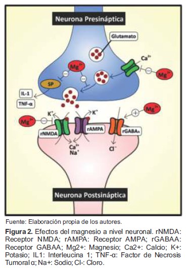 El magnesio disminuye la liberación de acetilcolina en la unión neuromuscular lo cual inhibe la transmisión de impulsos nerviosos induciendo relajación muscular y debilidad (5). En el sistema nervioso central el glutamato cumple una función excitatoria uniéndose tanto al receptor N-metil-D-aspartato (NMDA) como al receptor α-amino- 3-hidroxi-5-metilo-4-isoxazolepropionato (AMPA) de la neurona postsináptica. El magnesio bloquea los receptores NMDA, haciendo que sólo los receptores AMPA se activen y la respuesta excitatoria disminuya. Este proceso es amplificado por la acción de los receptores del ácido γ- aminobutírico (GABA), función también regulada por el magnesio. Los receptores GABAA son canales inotrópicos que se abren por unión con el neurotransmisor GABA, que permite el ingreso de cloro a la neurona. El magnesio extracelular estimula estos receptores, resultando en una hiperpolarización neuronal que se traduce en un efecto inhibitorio. Sumado a esto, el magnesio inhibe la liberación de glutamato en la neurona presináptica por inhibición de los canales de calcio dependientes de voltaje. Ya que para que exista liberación de este neurotransmisor, después de un potencial de acción debe generarse un flujo de calcio al interior de la neurona(1). Ver (Figura 2).