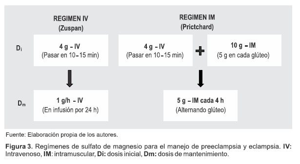 Existen dos regímenes bien conocidos y usados en la administración del sulfato de magnesio que parecen tener eficacias comparables (15,23), uno intravenoso (Zuspan) y otro intramuscular (Pritchard), los cuales se esquematizan en la (Figura 3).