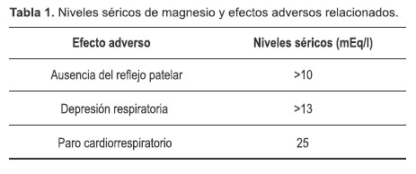 Tabla 1. Niveles séricos de magnesio y efectos adversos relacionados