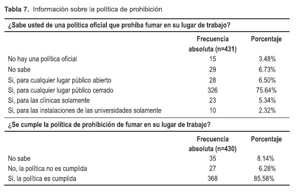 Con respecto al tema de reglamentación sobre el consumo de cigarrillo, 44 profesionales aseguran que no existe una política oficial que prohíba el consumo en lugares de trabajo o la desconocen (10.21%); de otro lado, el 6.28% (n=27; IC 95% 4.26-9.12) afirmó que la política no se cumple (Tabla 7).