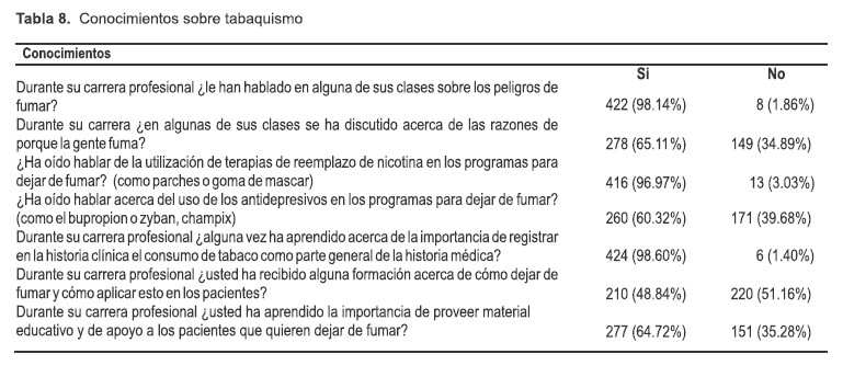 Por otra parte, se evidenció que existe aún desconocimiento de la normatividad vigente por parte de un pequeño grupo de profesionales y la inclinación mayoritaria del personal médico a apoyar las medidas regulatorias, así como la necesidad de realizar educación médica continua para mejorar la asesoría a los pacientes fumadores.