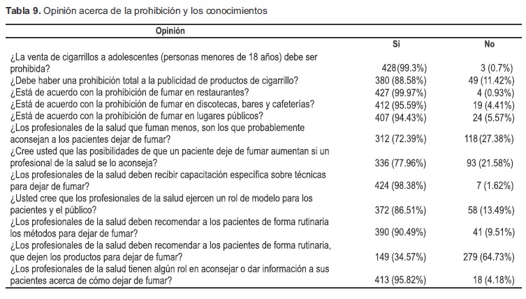 Tabla 9. Opinión acerca de la prohibición y los conocimientos