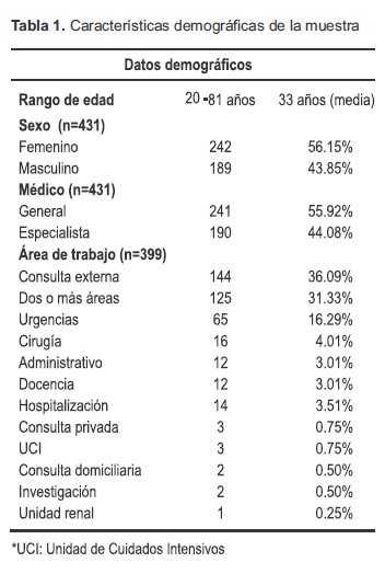 Se recolectaron 537 registros; por criterios de inclusión se eliminaron 37 por datos demográficos incompletos o ausentes, 33 con más del 20% de datos perdidos (8 preguntas o menos sin respuesta), 36 que corresponden a otros trabajadores de la salud, dejando un total de 431 encuestas para el análisis. Las características demográficas y el área de trabajo se pueden observar en la tabla 1 (Tabla 1)