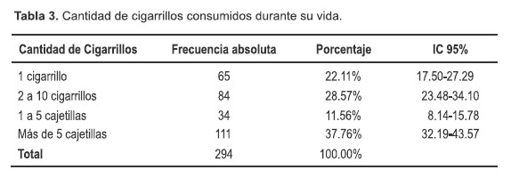 Tabla 3. Cantidad de cigarrillos consumidos durante su vida
