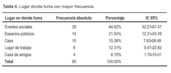 Se evaluó si durante el último año han existido intentos para dejar de fumar, encontrando que el 24.05% (n=71) de los médicos han continuado con el hábito pero solo el 12.54% (IC 95% 8.99-16.87) (n=9) han intentado dejar de fumar; el lugar donde suelen fumar con mayor frecuencia son los eventos sociales con un 44.62% de las veces (IC 95% 32.27- 57.47) (n=29) (Tabla 4) y el 31.94% de los fumadores actuales (IC 95% 5.47-22.82) (n=23), ha consumido cigarrillos en su lugar de trabajo durante el último año.