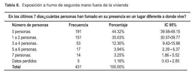Tabla 6. Exposición al humo de segunda mano fuera de la vivienda
