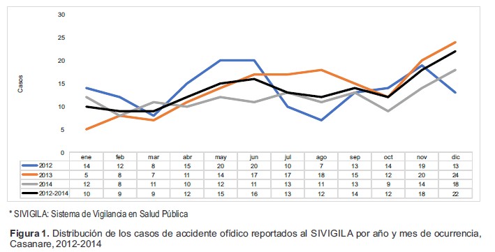 Figura 1. Distribución de los casos de accidente ofídico reportados al SIVIGILA por año y mes de ocurrencia, Casanare, 2012-2014