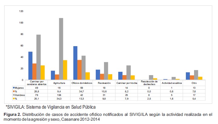 Figura 2. Distribución de casos de accidente ofídico notificados al SIVIGILA según la actividad realizada en el momento de la agresión y sexo, Casanare 2012-2014